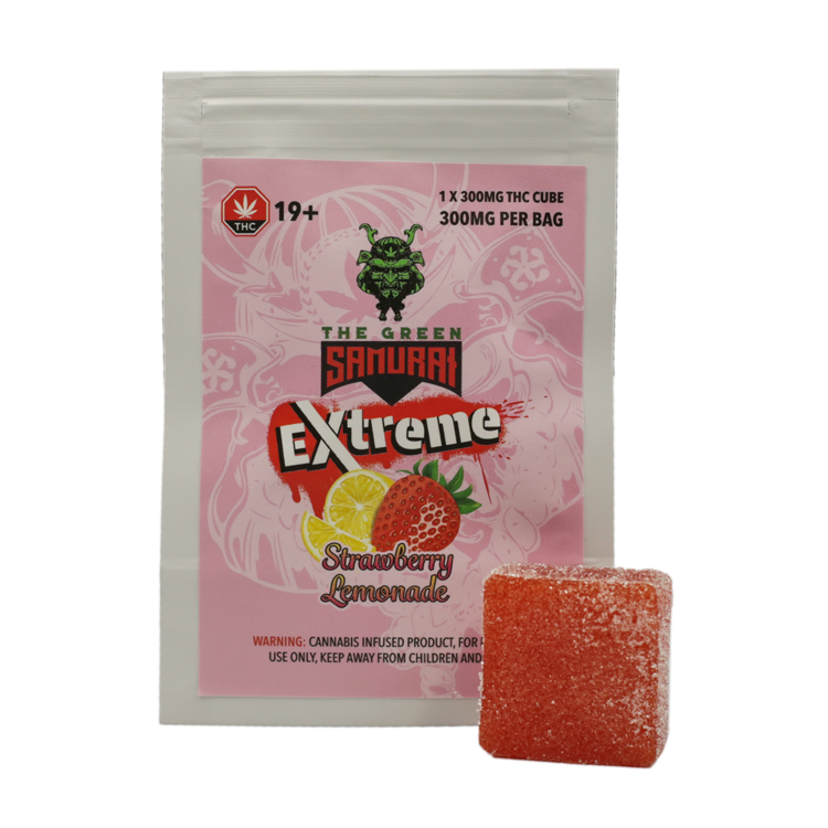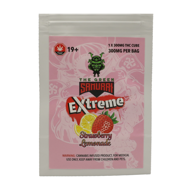 The Green Samurai Extreme handmade edibles offer 4 delicious and mouthwatering flavors of Cherry, Lemon, Strawberry-Lemonade and Grape. Each piece is infused with a precise dose of 300MG THC and can be cut up into preferred sizes to meet your daily need.